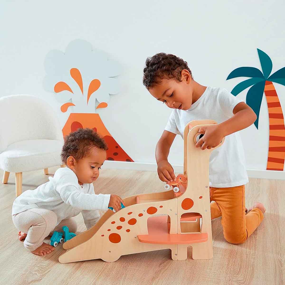 Este juego de garaje de madera grande, de 50 cm de alto, tiene un ascensor para acceder directamente al primer piso y al segundo, hasta la misma nariz del adorable dinosaurio. Para subir solo hay que poner el vehículo en la plataforma y girar los grandes ojos redondos del dinosaurio para accionar el ascensor. Y, para volver a bajar, ¿por qué no disfrutar de la espectacular rampa que recorre el largo cuello y el lomo de este acogedor animal? Este garaje de coches es ideal para niños a partir de 2 años. ¡Incluye cuatro vehículos dinosaurio de madera y dos cactus para decorar! ¡El pequeño pteranodón tiene su propia plataforma privada para acceder directamente al techo del garaje! Este juego es ideal para desarrollar la imaginación y la motricidad. Está hecho de madera FSC®.